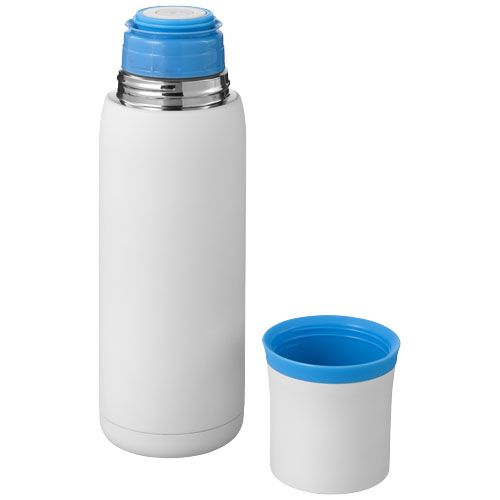 Flow vacuum insulating flask. The flow flask is a double wall stainless steel flask with vacuum isolation. This isolation provides the longest temperature retention. Equipped with a single-hand, push button pour spout and an integrated mug in cap. Top of the mug and bottom have skid-proof silicone pads. Volume is 500ml. Presented in a gift box. Exclusive design. Stainless steel interior and exterior.